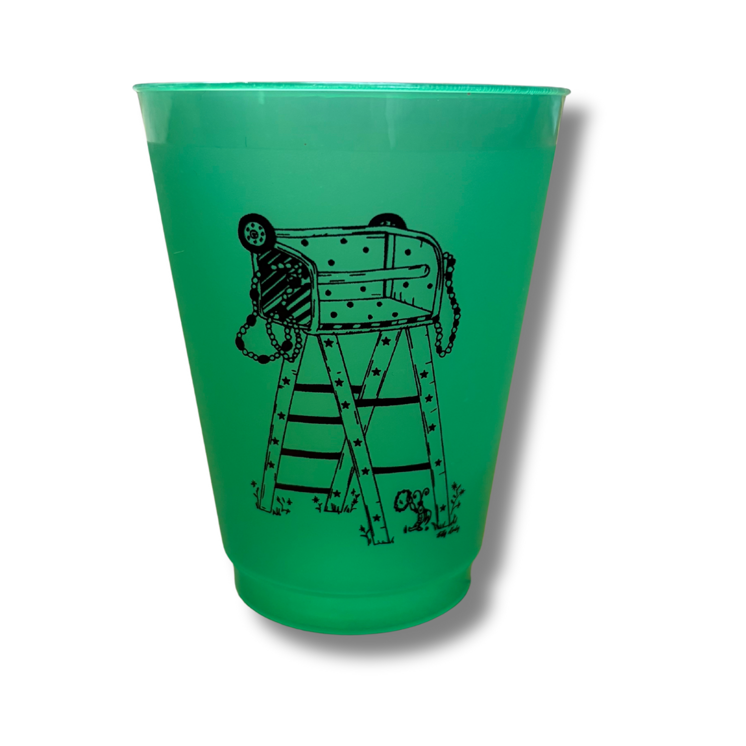 Green 16 oz plastic Mardi Gras cups. Custom Betty Hunley Designs.